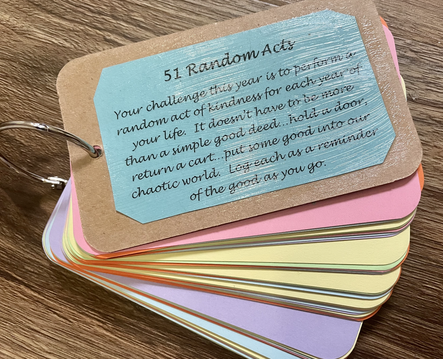 "Your challenge this year is to perform a random act of kindness for each year of your life. It doesn't have to be more than a simple good deed…hold a door, return a smile Put some good into our chaotic world and log each as a reminder of the act as you go."