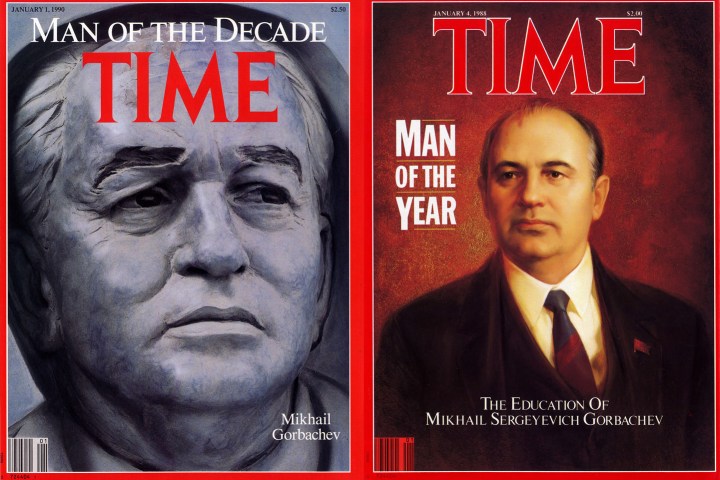 The paired Time Magazine covers are of their time but reflect Mikhail Gorbachev's place in history: revered abroad, reviled at home. The man who ended the Cold War died yesterday at the age of 91.