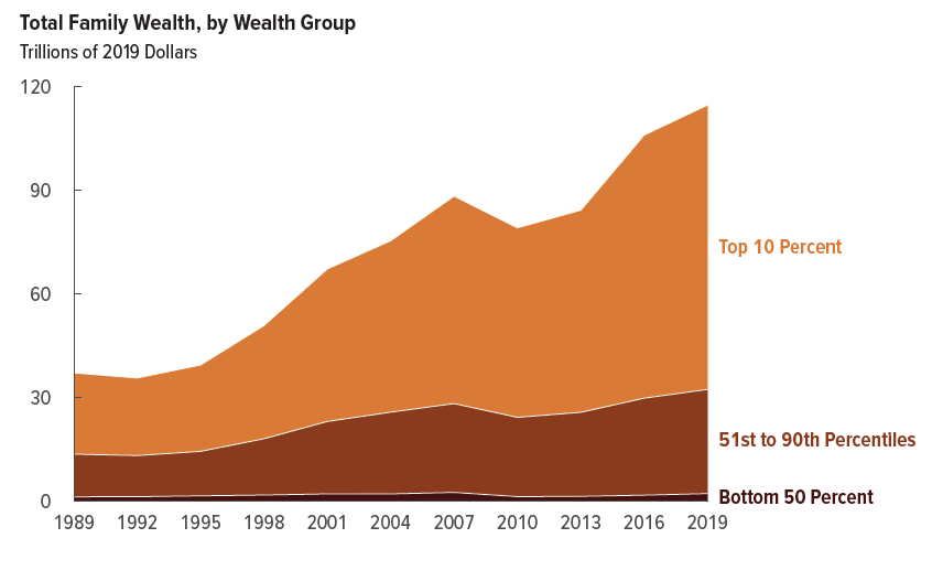 In 2019, total family wealth in the United States—that is, the sum of all families' assets minus their total debt—was $115 trillion. That amount is three times total real family wealth in 1989. Measured as a percentage of the nation's gross domestic product, total family wealth increased from about 380 percent to about 540 percent over the 30-year period from 1989 to 2019, CBO estimates. ... From 1989 to 2019, the total wealth held by families in the top 10 percent of the wealth distribution increased from $24.3 trillion to $82.4 trillion (or by 240 percent), the wealth held by families in the 51st to 90th percentiles increased from $12.7 trillion to $30.2 trillion (or by 137 percent), and the wealth held by families in the bottom half of the distribution increased from $1.4 trillion to $2.3 trillion (or by 65 percent).