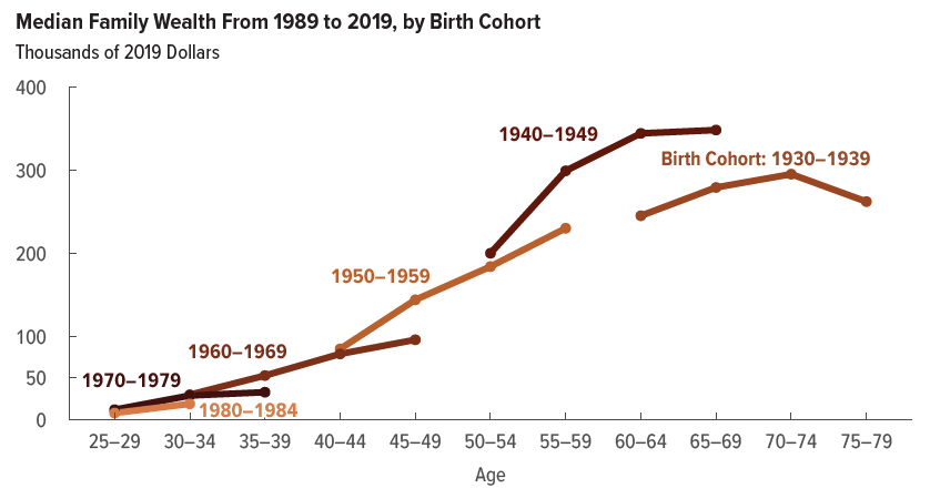 Finally, the pattern of wealth accumulation over the life cycle appears to be shifting. In this graph, notice that those born in the 1940s have substantially more wealth when they reach their 60s than does the previous generation of those born in the 1930s. However, the generation born in the 1950s is on a lower trajectory: that is, their median wealth in their late 50s is less than what has been accumulated by the generation born in the 1940s. As you work down to more recent generations, each line is below that for the previous generation: that is, each generation is accumulating less wealth than the previous generation did at the same age.