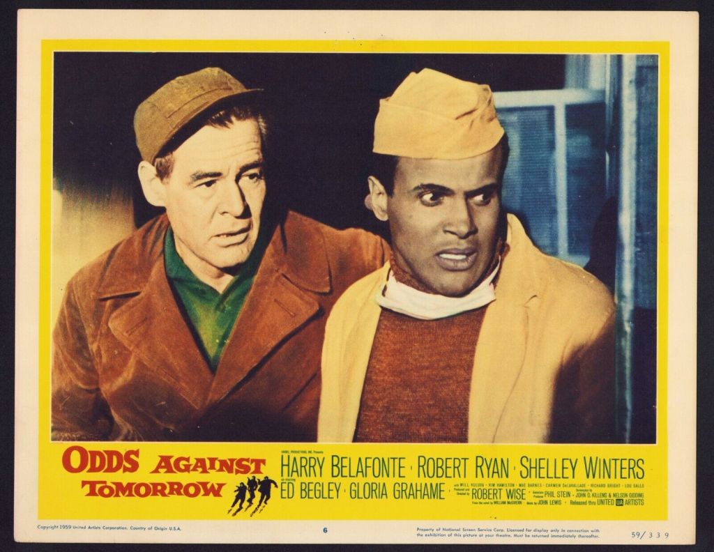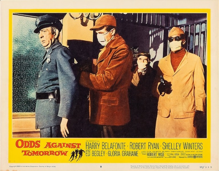 Odds Against Tomorrow tells the story of three desperate men who come together to rob a bank in upstate New York. Belafonte is a nightclub singer deep in debt to the mob. They demand payment, so Belafonte reluctantly joins Ed Begley and Robert Ryan in the caper. Begley is a former cop on the skids and Ryan plays an embittered racist veteran. Ryan's use of the n-word onscreen was one of the first times it was in a Hollywood movie. He only used it once, which made it more powerful.