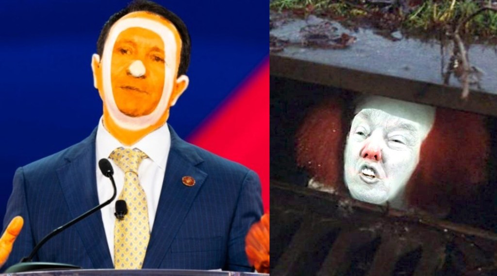 At Clownfish Restaurant, Trumpalaya is served with word salad and Diet Coke to drink. Former President* Pennywise slathers it with ketchup and keeps the bottle handy in case he needs to throw something in a fit of pique. Ketchup makes a satisfying splatter on the wall.