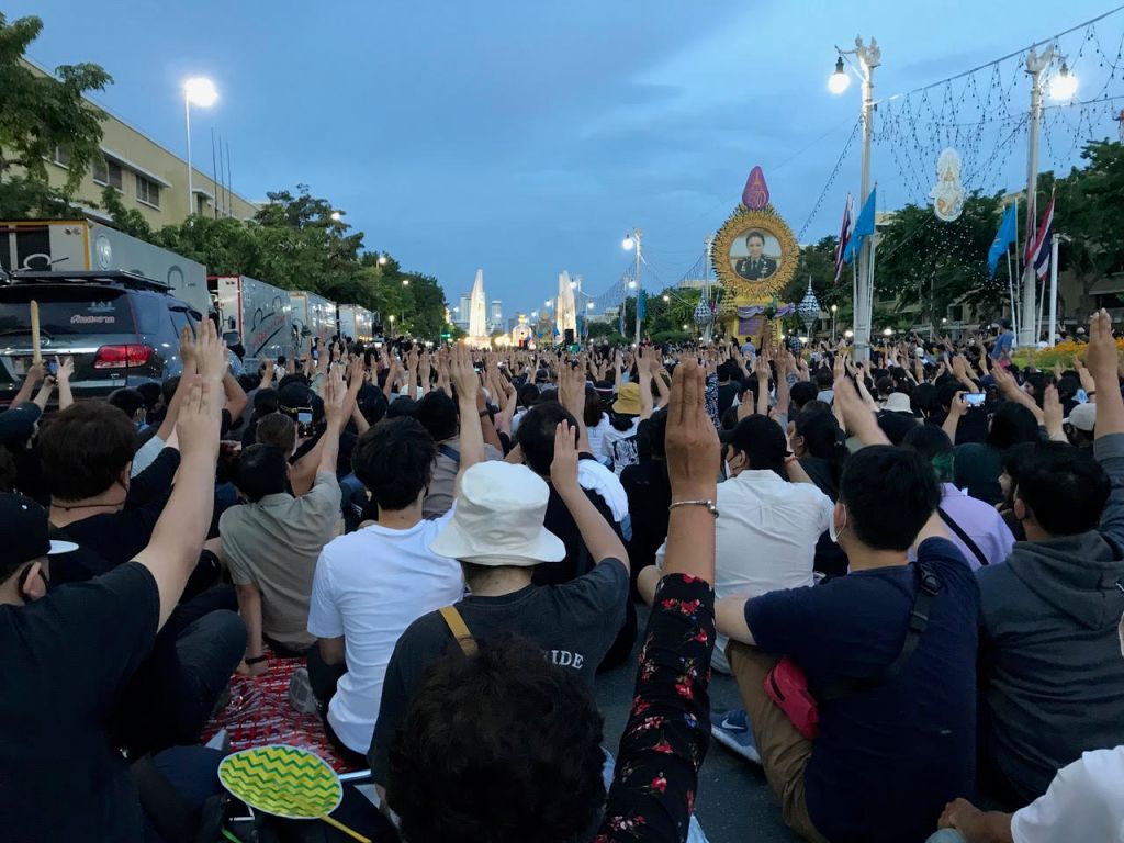Protesters displaying three-finger salute in front of Democracy Monument at August 16 protest.