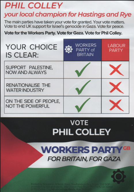 The Labour leaflet - and the letter that arrived the same day - were adorned with pictures of Starmer. I won't grieve you by sharing them but will just point out that slogan of his, "country first, party second". For all the union flag pics he plasters his mail outs with, the country he's talking about appears to be Israel.