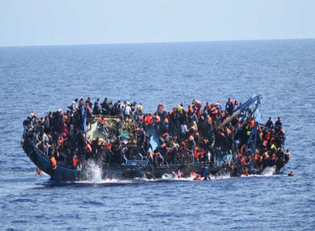 A boat carrying over 500 migrant people capsizing off the Libyan coast in 2013 (Photo cred: Italian Navy via AFP)