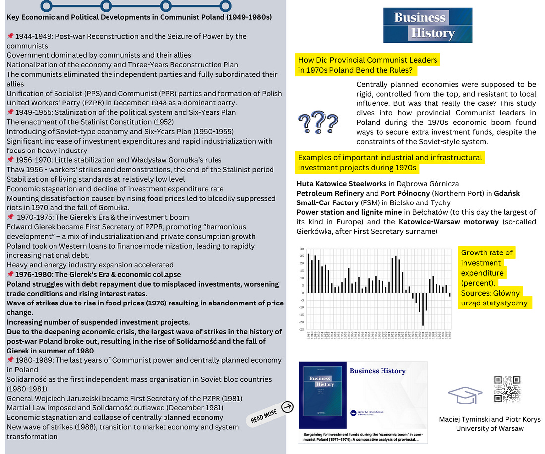 Organizational History Network New research on investment funds in communist Poland [includes poster]by Maciej Tymiński & Piotr Koryś, in Business HistoryHow Did Provincial Communist Leaders in 1970s Poland Bend the Rules? Centrally planned economies were meant to be rigid, controlled from the top, and resistant to local influence. But was that really the case? Business History research shows how provincial Communist leaders in Poland during the 1970s found creative ways to secure extra investment funds despite the constraints of the Soviet-style system. The article examines key industrial projects, economic strategies, and the eventual crisis that led to the collapse of the system. Read more in 𝐁𝐚𝐫𝐠𝐚𝐢𝐧𝐢𝐧𝐠 𝐟𝐨𝐫 𝐢𝐧𝐯𝐞𝐬𝐭𝐦𝐞𝐧𝐭 𝐟𝐮𝐧𝐝𝐬 𝐝𝐮𝐫𝐢𝐧𝐠 𝐭𝐡𝐞 ‘𝐞𝐜𝐨𝐧𝐨𝐦𝐢𝐜 𝐛𝐨𝐨𝐦’ 𝐢𝐧 𝐜𝐨𝐦𝐦𝐮𝐧𝐢𝐬𝐭 𝐏𝐨𝐥𝐚𝐧𝐝 (𝟏𝟗𝟕𝟏–𝟏𝟗𝟕𝟒): 𝐀 𝐜𝐨𝐦𝐩𝐚𝐫𝐚𝐭𝐢𝐯𝐞 𝐚𝐧𝐚𝐥𝐲𝐬𝐢𝐬 𝐨𝐟 𝐩𝐫𝐨𝐯𝐢𝐧𝐜𝐢𝐚𝐥 𝐚𝐩𝐩𝐚𝐫𝐚𝐭𝐜𝐡𝐢𝐤𝐬’ 𝐞𝐧𝐠𝐚𝐠𝐞𝐦𝐞𝐧𝐭 by Maciej Tymiński & Piotr Koryś https://doi.org/10.1080/00076791.2024.2448496 Organizational History Network is free today. But if you enjoyed this post, you can tell Organizational History Network that their writing is valuable by pledging a future subscription. You won't be charged unless they enable payments. |