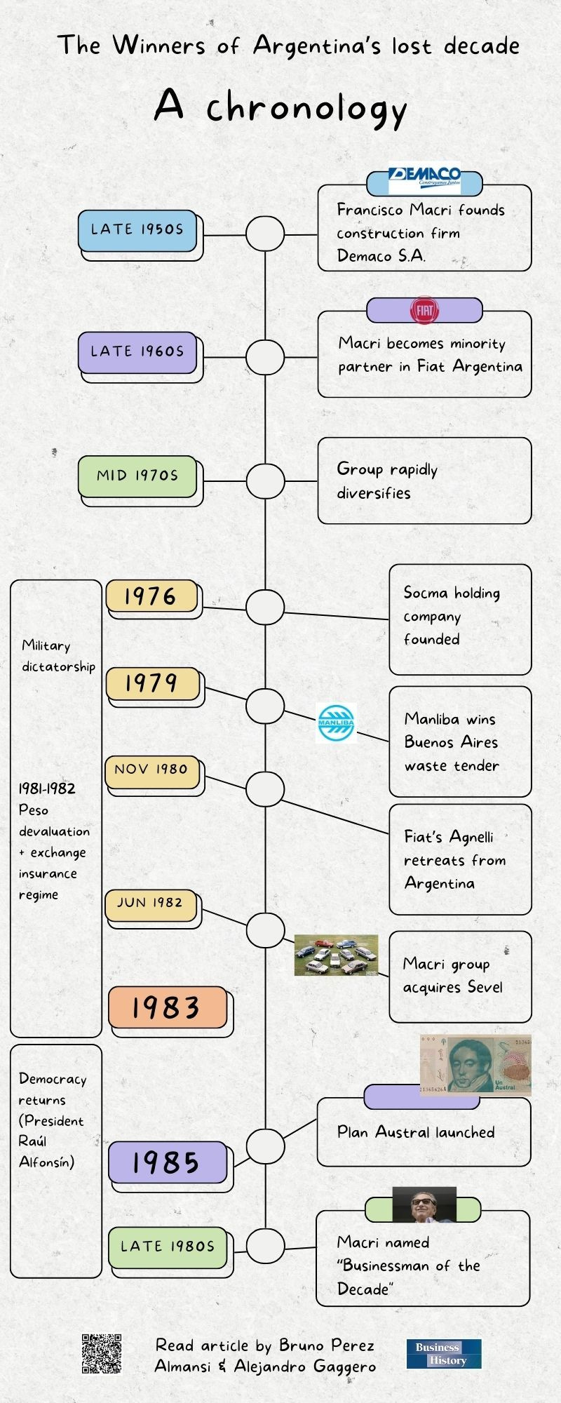 New research on the businessmen who restructured the rules of the game during Argentina's 🇦🇷 debt crisisAn article just published on Business History (w/ a graphic timeline in post!)While the world watched Argentina’s debt crisis, a small group of businessmen restructured the rules of the game—from inside the state. The article 𝐓𝐡𝐞 𝐰𝐢𝐧𝐧𝐞𝐫𝐬 𝐨𝐟 𝐭𝐡𝐞 𝐥𝐨𝐬𝐭 𝐝𝐞𝐜𝐚𝐝𝐞. 𝐓𝐡𝐞 𝐞𝐱𝐩𝐚𝐧𝐬𝐢𝐨𝐧 𝐨𝐟 𝐭𝐡𝐞 𝐌𝐚𝐜𝐫𝐢 𝐛𝐮𝐬𝐢𝐧𝐞𝐬𝐬 𝐠𝐫𝐨𝐮𝐩 𝐝𝐮𝐫𝐢𝐧𝐠 𝐭𝐡𝐞 𝐜𝐫𝐢𝐬𝐢𝐬 𝐨𝐟 𝐭𝐡𝐞 𝟏𝟗𝟖𝟎𝐬 𝐢𝐧 𝐀𝐫𝐠𝐞𝐧𝐭𝐢𝐧𝐚 https://doi.org/10.1080/00076791.2025.2456278 by Bruno Perez Almansi & Alejandro Gaggero shows how Grupo Macri successfully acquired major automotive subsidiaries like Fiat and Peugeot, becoming a leading vehicle producer despite the challenging economic climate. The study argues that the group's growth stemmed from its adept management of local and foreign resources, leveraging trade protectionist policies and macroeconomic instability to partner with multinational corporations hesitant to operate directly in Argentina. You're currently a free subscriber to Organizational History Network. For the full experience, upgrade your subscription. |