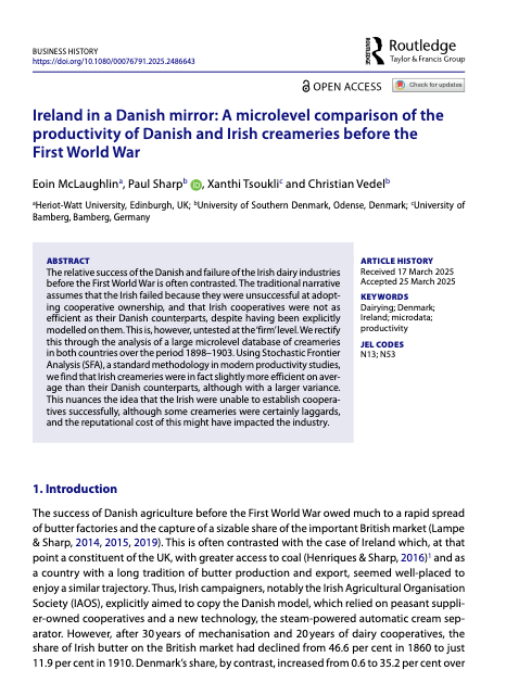 Irish vs. Danish creameries at the turn of the 20th centuryRead the latest 🐄📉 research https://doi.org/10.1080/00076791.2025.2486643A long-standing myth says Irish cooperatives just weren’t up to the task. "Ireland in a Danish mirror: A microlevel comparison of the productivity of Danish and Irish creameries before the First World War" by Eoin McLaughlin, Paul Sharp, Xanthi Tsoukli & Christian Vedel, analyzing detailed productivity data from over 600 creameries between 1898 and 1903, reveals that Irish dairies were actually slightly more efficient on average than their Danish peers. Read the full article: https://doi.org/10.1080/00076791.2025.2486643 You're currently a free subscriber to Organizational History Network. For the full experience, upgrade your subscription. |