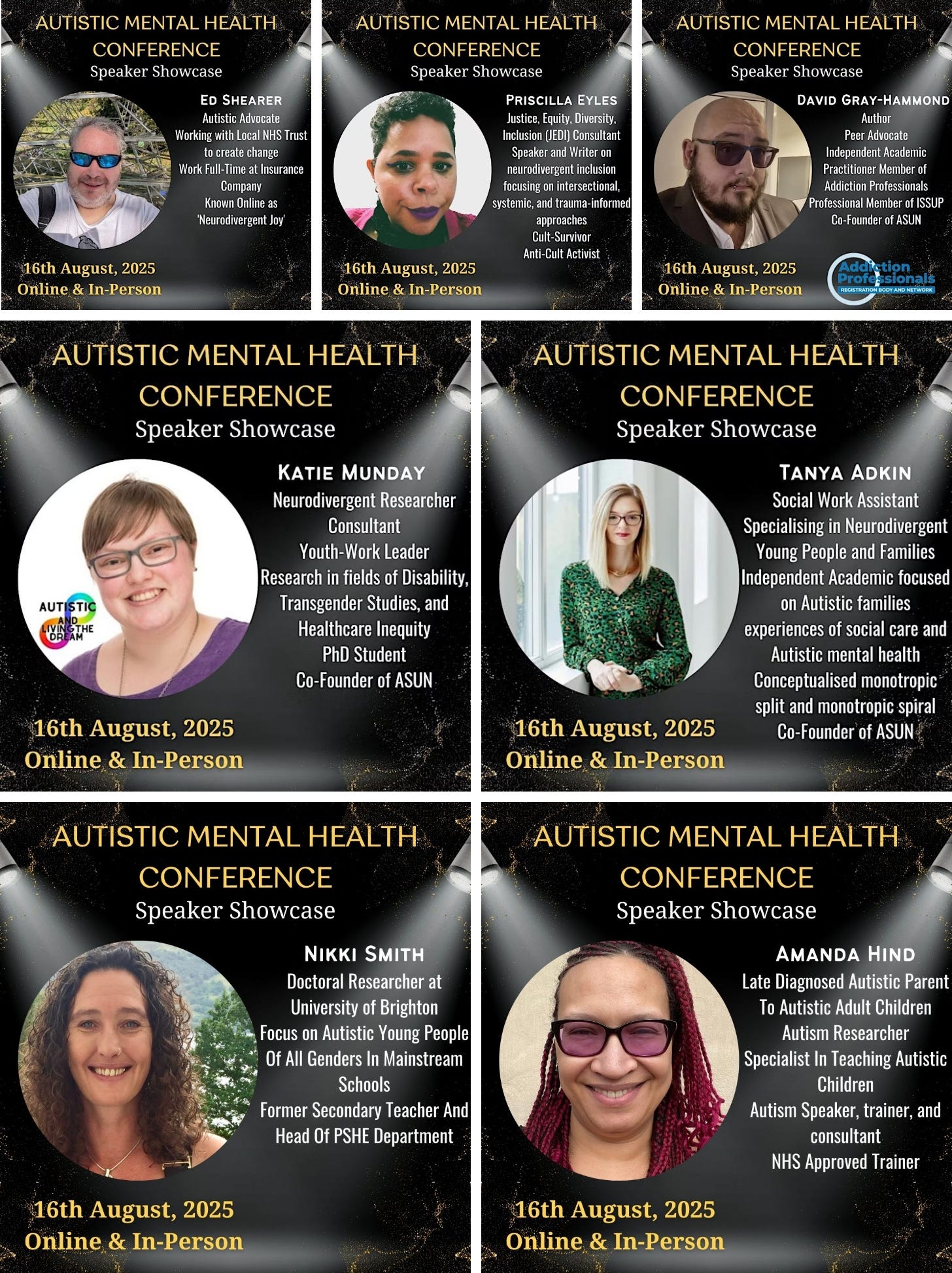 Autistic Mental Health Conference: Less Than One Month!Get your ticket now to access this event online or in person!We have less than one month until the Autistic Mental Health Conference 2025! This event will feature some trailblazing Autistic professionals and academics talking about Autistic Mental Health and the systemic issues we face. The event is hybrid, and will be available to attend online or in person, recordings will be available to all ticket holders! Some of the talks you will get to hear: