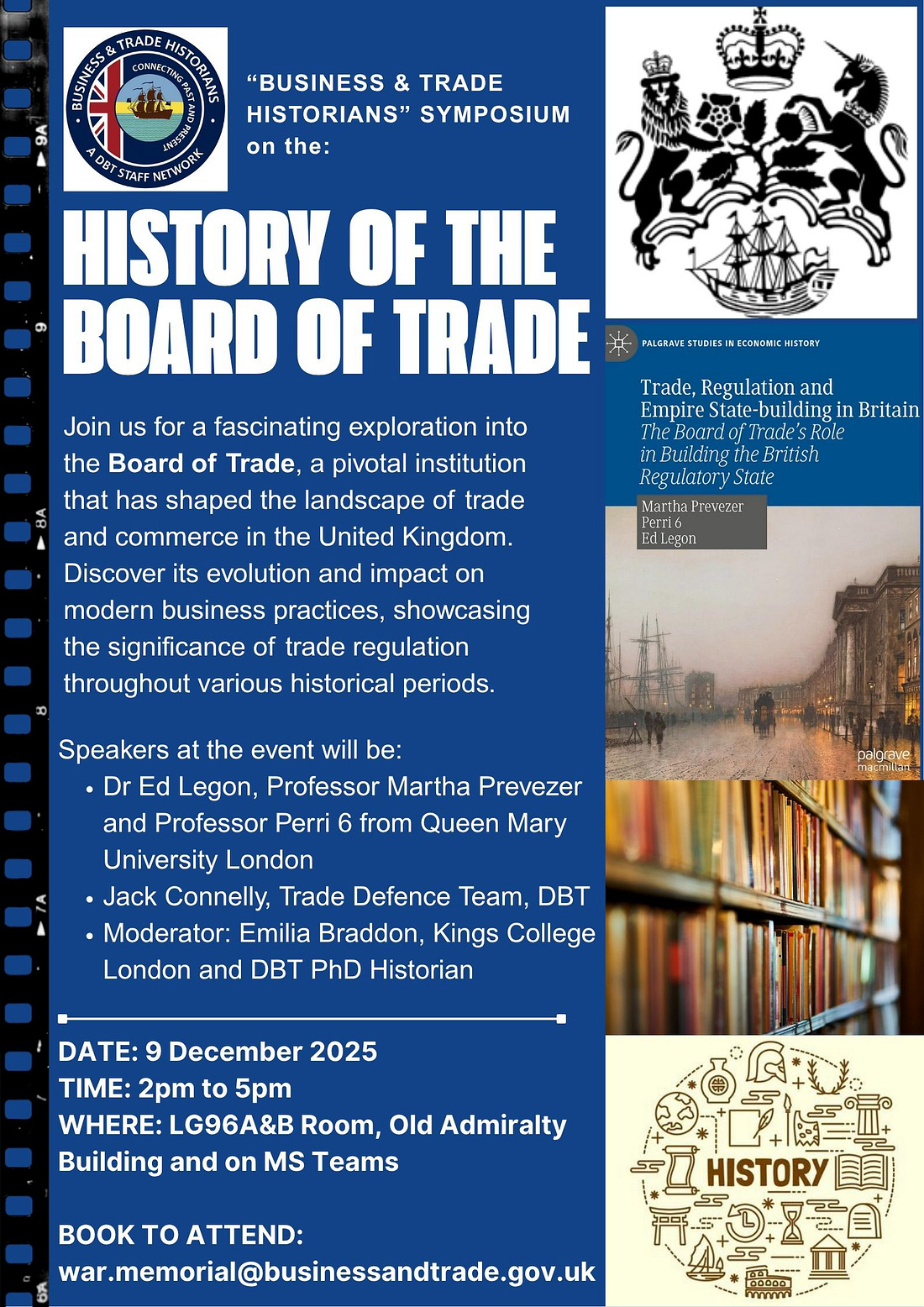 History of the Board of TradeOrganized by the Business & Trade Historians, the voluntary staff history network at the Department for Business & TradeThe Business & Trade Historians, the newly renamed voluntary staff history network at the Department for Business & Trade (DBT), are inviting you to a special DBT symposium on the “History of the Board of Trade”, taking place on Tuesday 9 December between 2pm and 5pm in the Old Admiralty Building, or online. Please indicate if you would like to attend in person as space in the room is limited to 40 people! This event offers a unique opportunity to reflect on the rich and complex history of DBT’s predecessor departments, tracing their evolution through four centuries of business, trade, regulation, and evolution of government and the state. Whether you’re a policy professional, historian, or simply curious about the institutional legacy that shapes DBT’s work today, this symposium will offer valuable insights into how the past continues to inform the present. Symposium Themes and SpeakersThe programme will explore key historical moments through short presentations by leading scholars and practitioners: