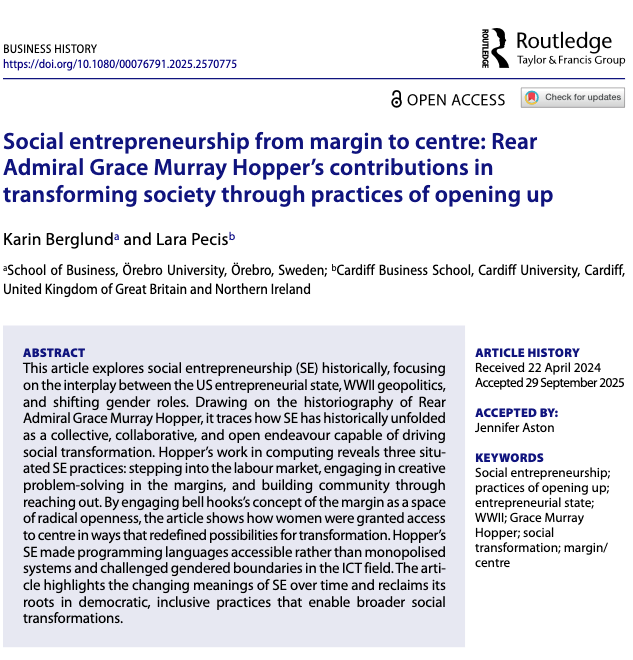 New publication in Business HistorySocial entrepreneurship from the margins of gender, labor, and wartime necessity, by Karin Berglund and Lara PecisKarin Berglund and Lara Pecis revisit the story of Rear Admiral Grace Murray Hopper—a computing pioneer whose open, collaborative practices transformed both technology and society. Their Business History article traces how Hopper’s work during and after World War II reflected a form of social entrepreneurship that emerged not from corporate boardrooms but from the margins of gender, labor, and wartime necessity. By linking Hopper’s legacy to bell hooks’s idea of the margin as a “space of radical openness,” the authors reveal how inclusive innovation can challenge power structures and expand access to knowledge. This historical perspective reminds us that social entrepreneurship has long been about democratizing systems—whether programming languages or social opportunities—and that its transformative potential depends on keeping openness at the center. Read in Business History You're currently a free subscriber to Organizational History Network. For the full experience, upgrade your subscription. |