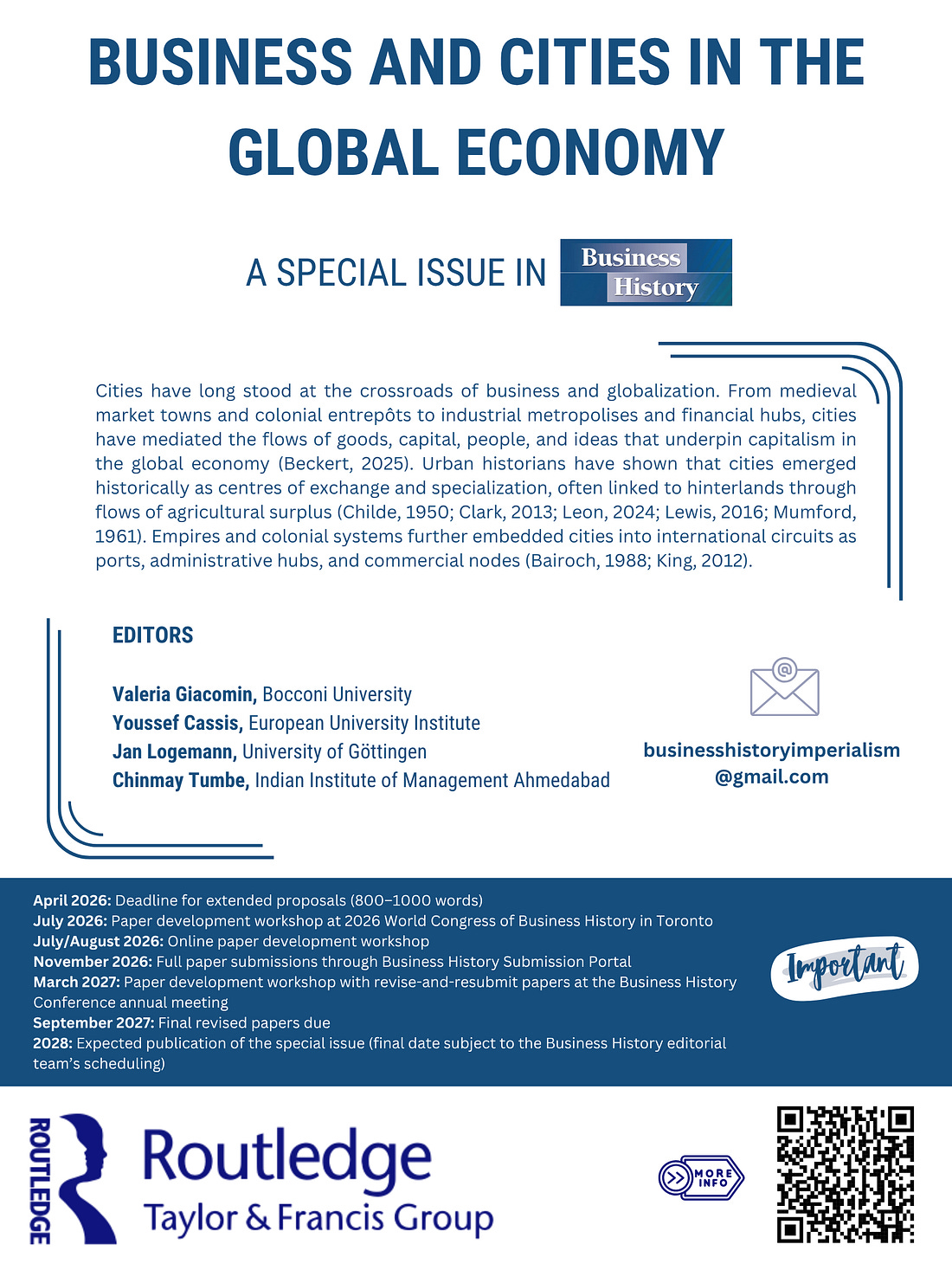 Key dates: • April 2026: Extended proposals due (800–1000 words) • July 2026: Development workshop at the World Congress of Business History (Toronto) • Nov 2026: Full paper submissions • March 2027: Revise and resubmit workshop at the BHC Annual Meeting • Sept 2027: Final revised papers • 2028: Expected publication
