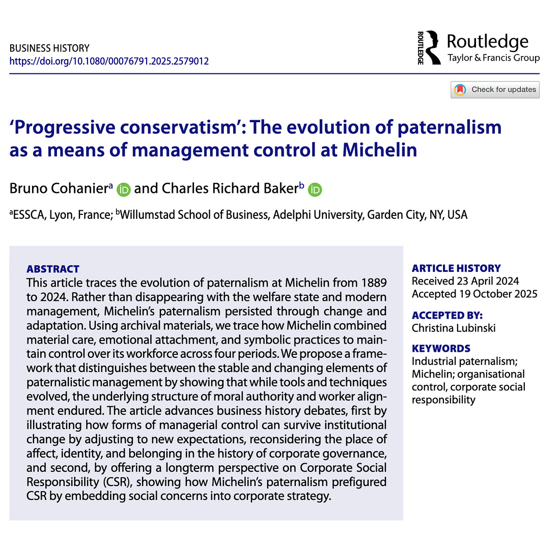 New Publication in Business History‘Progressive conservatism’: The evolution of paternalism as a means of management control at Michelin, by Bruno Cohanier & Charles Richard BakerThis study examines more than a century of how Michelin managed its workforce, showing that paternalism did not vanish with the rise of the welfare state, new labor regulations, or modern HR. Instead, it adapted. The article traces how the company blended material benefits, emotional bonds, and symbolic gestures to build loyalty and maintain authority from the 1880s to the present. This long perspective helps explain why some management practices endure even when institutions, worker expectations, and regulatory frameworks shift. The findings move beyond Michelin. They raise questions about how firms today use care, identity, and belonging to shape employee behavior. The study also reframes Corporate Social Responsibility as part of a deeper tradition: a strategy where social concerns support managerial control as much as community well-being. Invite your friends and earn rewardsIf you enjoy Organizational History Network, share it with your friends and earn rewards when they subscribe. |