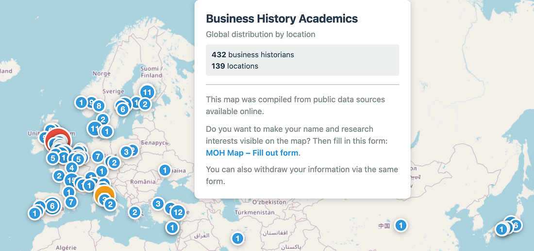 The dataWhere does the data come from?All data for this map were compiled from publicly available digital sources. The majority of entries were drawn from Google Scholar, where academics can enter their subject interests. Additional searches were also conducted, but yielded fewer and less reliable results. Some of these results were included. What data underpins the map?The Github files only contain numbers and no identifying information, unless released by the person. Where is the data stored?The data is stored in a secure folder on an institutional OneDrive, which is GDPR-compliant. If you want to know if your name is included, submit the form. If you want to be removed from the underlying dataset, fill in the form and I will confirm removal via email. All data from the form submission is stored in the same OneDrive folders, and the form is also part of the institutional Microsoft 365 subscription and GDPR-compliant. What now?Fill in the form and add yourself to the map. If you feel like it, opt in to display your information (realistically, we are semi-public as professionals already). Share it with your colleagues, so we get a better map. But why?Wouldn’t it be nice if we all knew who we are, where we are, and what we do? You're currently a free subscriber to Organizational History Network. For the full experience, upgrade your subscription. |