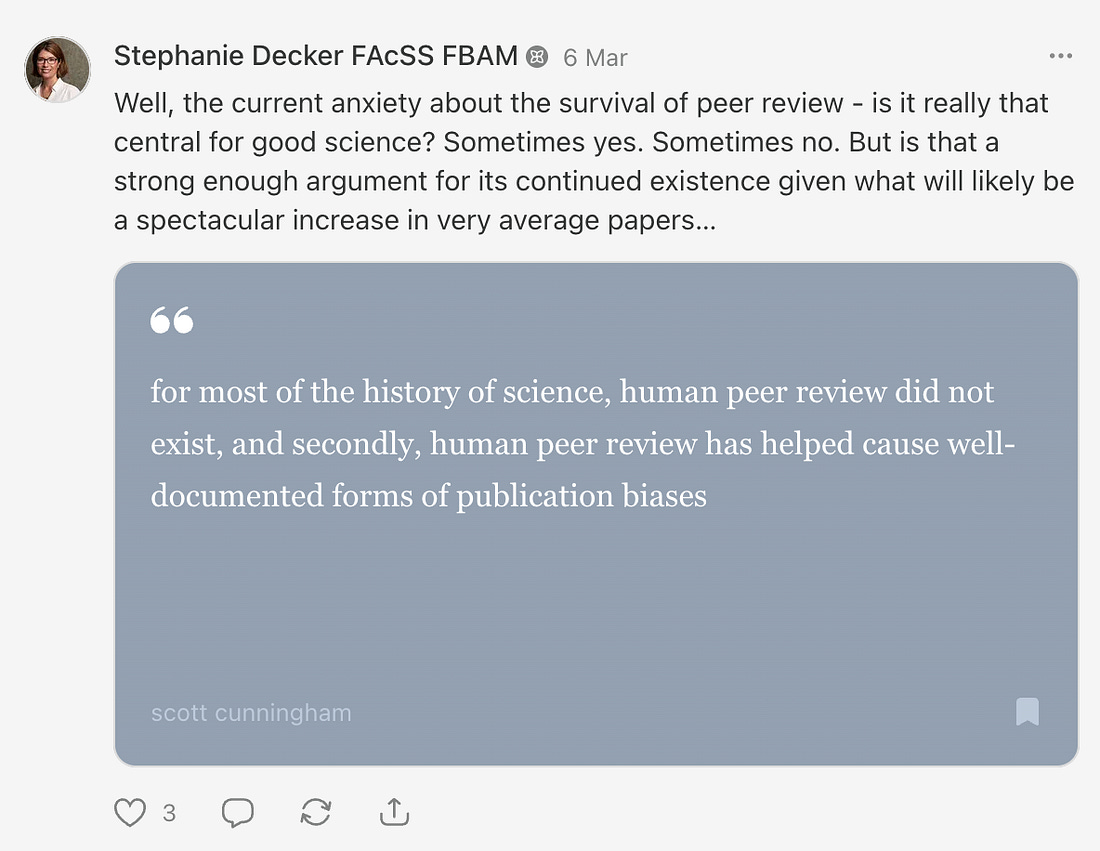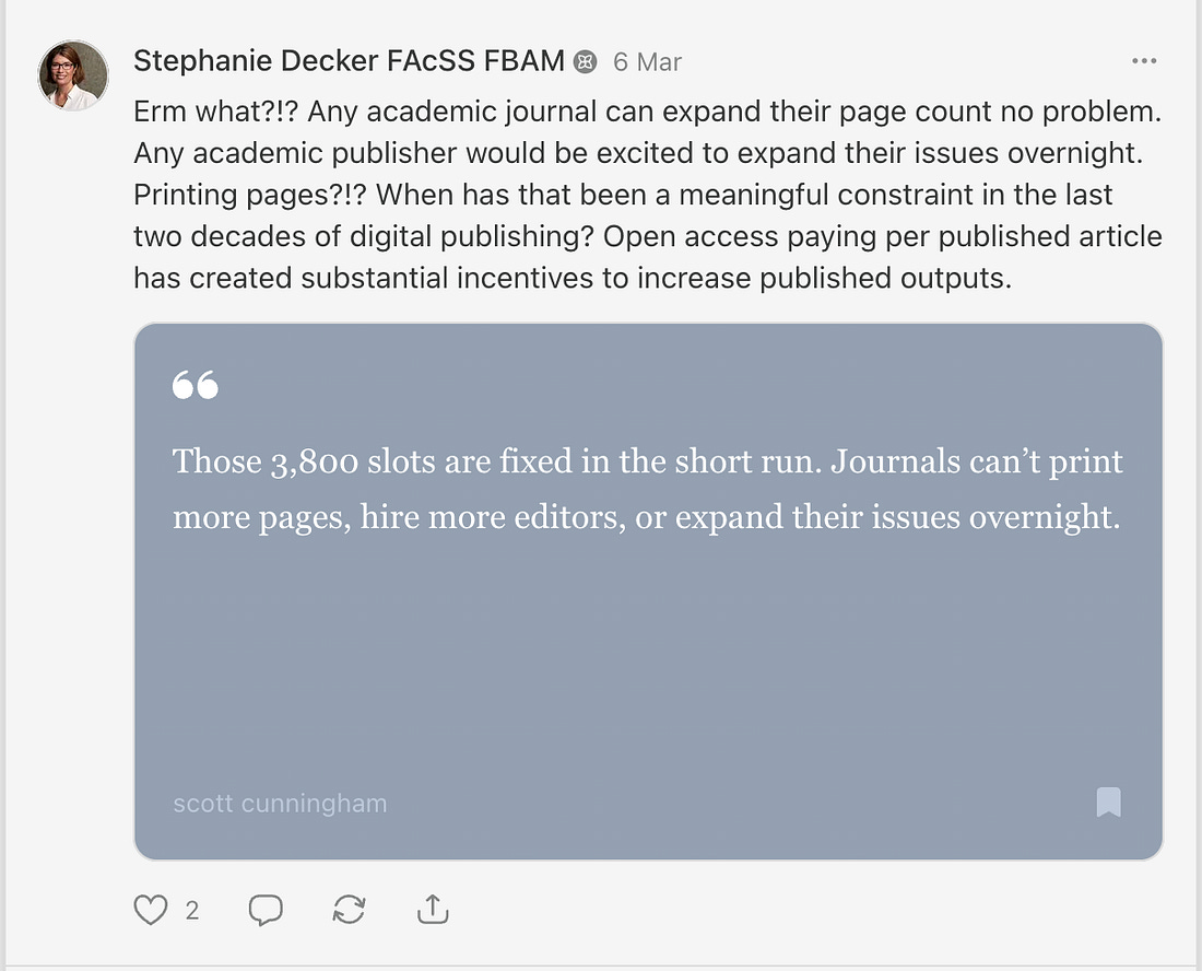That’s the ground-level experience right now. Economists, of course, like to take the high ground. They also, it turns out, make their successful paid (ok, probably the archives function), so if you want to read it for yourself, you will need the 7-day trial. I really liked Scott Cunningham’s post, though some aspects really made my eyes roll madly in their sockets. The first one was this: Clearly, there is no scarcity in potential output space. Economists may think so, but that reflects distinct disciplinary institutions that reinforce a potentially even more hierarchical journal structure than the one in business and management. Since nobody properly pays editors (though this varies by field), you can hire them just fine. Editors are dirt cheap. The constraints are how many more papers we actually want to publish and whether we can effectively expand quality control. At a relevant meeting last week, there were some general statements that publishing 1,500 or indeed 2,000 papers per year is clearly not aligned with quality control. It’s a generous assessment; even with a large team, I’d think the boundary for any one journal would be lower. But Cunningham’s argument is about a range of journals, and, as a larger field, business and management has many more of them. So the idea that there is a limited, not at all dynamic pool of slots being targeted by authors, AI-assisted or otherwise, seems fanciful. I agreed more heartily with the challenge of human peer review. So, is human peer review dead? Probably. Is that such a disaster? I totally agree with Scott Cunningham, and so do others like Dave Karpf (now over at Beehiv). Karpf goes further, arguing it is the eulogy of the social science paper. By and large, his argument amounts to Goodhart’s law: we need to consider whether we are measuring the right thing for tenure, promotion, appointment, etc.