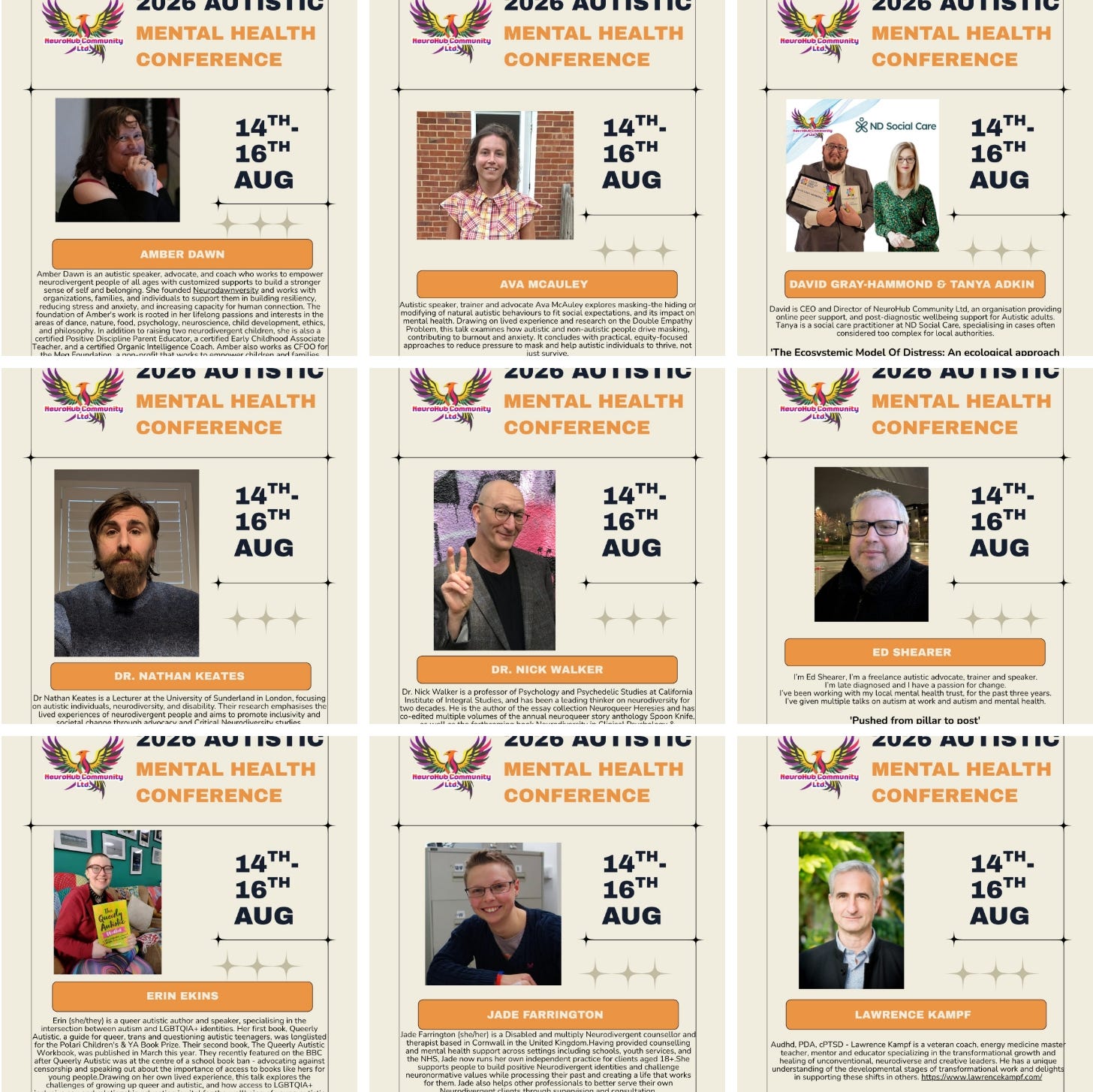 Speaker Line UpFriday 14th AugustFriday August 14th 12:05pm – 12:20pm Sarah Meharg‘Self advocating for reasonable adjustments’ Friday 14th August 1:50pm – 2:30pm Lawrence Kampf‘Grounding: Embodiment and Regeneration for the Neuro-complex – an experience’ Friday August 14th 3:30pm – 4:40pm David Gray-Hammond & Tanya Adkin‘The Ecosystemic Model Of Distress: An ecological approach to Autistic and monotropic wellbeing’ Friday 14th August 5:00pm -5:40pm Dr. Nick Walker‘Unorthodox Approaches to the Cultivation of Autistic Psychological Resilience’ Saturday 15th AugustSaturday August 15th 10:20am -11:00 am Dr. Nathan Keates‘Power and Meaning: Autistic Mental Distress’ Saturday August 15th 11:10am -11:50am Ed Shearer‘Being Pushed from Pillar to Post’ Saturday August 15th 12:05pm – 12:20pm Nic James‘The Sensory Scrum: Navigating the Microclimate of the Rugby Pitch as an Autistic Referee’ Saturday August 15th 1:10pm – 1:50pm Jessica DarkSaturday August 15th 2:00pm – 2:40pm Karen ParkerSaturday August 15th 3:00pm – 3:40pm Nikki Smith‘Platforming autistic voices in research’ Saturday August 15th 3:50pm – 4:30pm Ava McAuley‘Survival on the Surface: Understanding Masking, Misunderstandings and Mental Health in Autism’ Saturday August 15th 5:00pm – 5:40pm Erin Ekins‘Under The Double Rainbow: Growing up Queerly Autistic and Proud’ Sunday 16th AugustSunday August 16th 2:45pm – 3:25pm Stacy Badon‘Parallel Neurotypes: Navigating Co-Regulation in Neurodivergent Families’ Sunday August 16th 3:30pm – 4:10pm Amber Dawn‘The Breadth of Breaking Bread; Supporting Neurodivergent Relationships with Food Intake and Sharing A Meal’ To purchase your ticket, click the link below! You're currently a free subscriber to NeuroHub Community Journal | Newsletter | Announcements. For the full experience, upgrade your subscription.