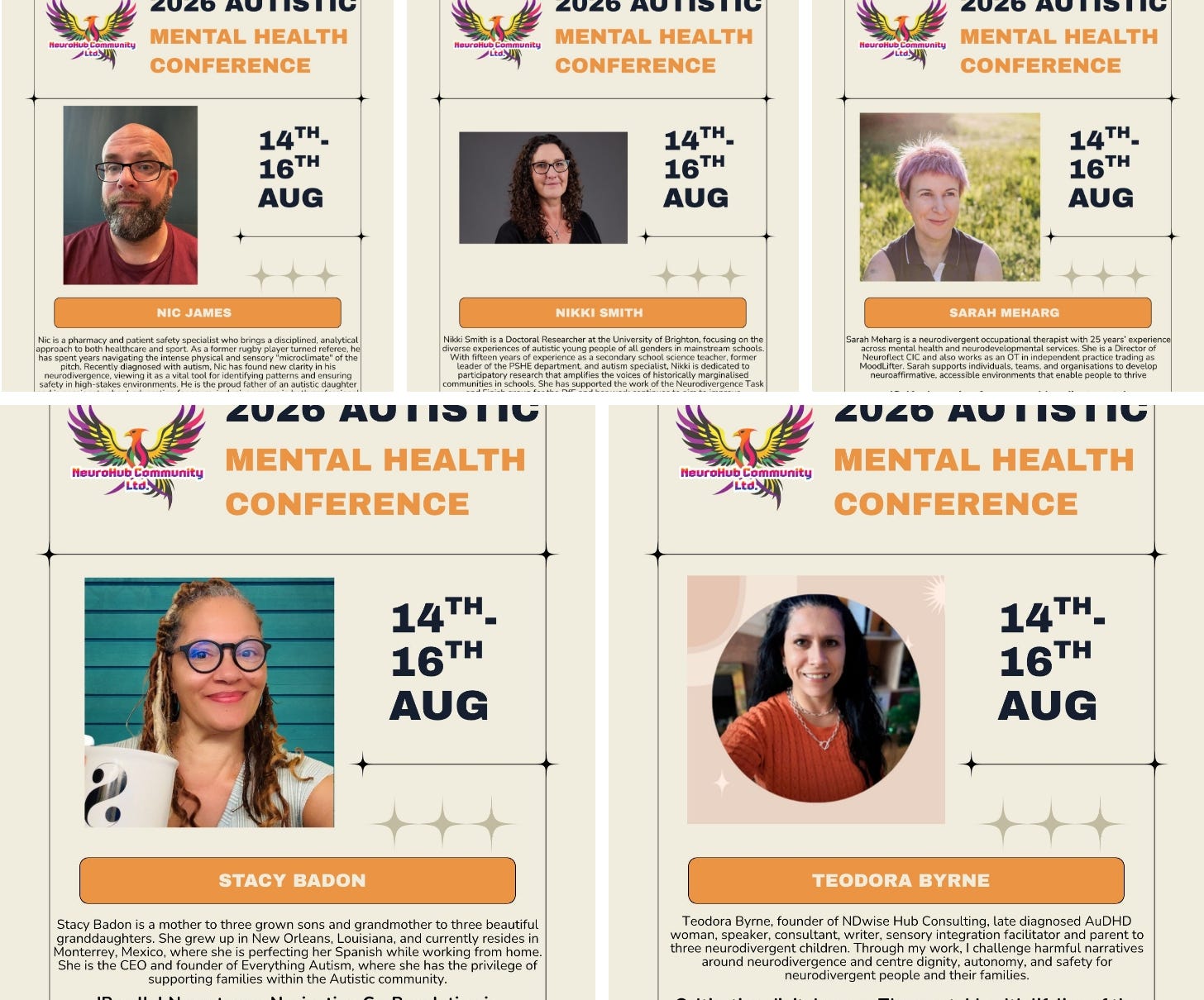 What to expect from the conferenceAcross three inspiring days, the NeuroHub Mental Health Conference explores the theme “Ecosystemic Causes of Mental Health Issues”—examining how environments, systems, and societal structures shape neurodivergent wellbeing. From Friday 14th to Sunday 16th August (10am–6pm BST), you’ll experience a rich and varied programme of 40-minute talks, 15-minute lightning sessions, and pre-recorded contributions from both experts and lived-experience speakers. Each session is designed to deepen understanding, challenge traditional narratives, and offer meaningful, practical insight. You’ll have the opportunity to learn from neurodivergent-led research and perspectives, connect with a supportive community of peers, professionals, and allies, and gain practical strategies you can apply in everyday life or professional practice. The conference is fully hybrid and accessible, with online access available for all three days—so you can join from anywhere in the world. Day two (Saturday 15th August) also offers an optional in-person experience in Coldean, Brighton & Hove, UK, where attendees can enjoy additional elements including stalls, food, and entertainment alongside the live sessions. All talks will be recorded and made available to ticket holders, so you can revisit sessions or catch up in your own time. https://neurohubcommunity.org/2026-autistic-mental-health-conference/